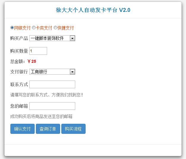 自动发卡平台源码 v2.0 1014 KB101人下载该软件是一个以php+MySQL进行开发的个人版自动发卡网站源码。网站功能:1、支付接口2、换购率设置3、商品管理4、订单管理5、smtp设置6、修改密码使用说明:自动发卡平台源码可以放入任何站点安装徐大大个人自动发卡平台http://您的域名/install.php后台地址ht