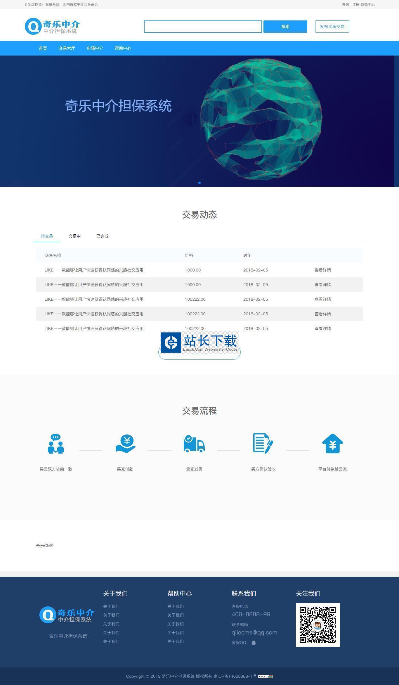 奇乐中介担保系统免费版16.66MB101人下载奇乐中介担保交易系统是国内首款中介担保交易系统,旨在为广大用户提供更加安全高效的虚拟资产担保平台。奇乐中介担保系统安装说明:1、访问首页安装程序.后台地址 /admin.php2、系统默认支持 linux+apche ,如果页面无法打开说明你用的是nginx 或者iis,请到官方论坛寻找配置方法奇乐中介担保系统升级说明:1、修复会员中心支付宝充值不显示的问题