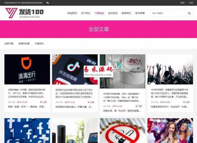 发货100虚拟商品自动发货系统14.38MB101人下载发货100-虚拟商品自动发货系统是一套功能强大的虚拟商品自动发货系统/文章付费阅读系统,无需人工值守,客户在线购买即可自动完成交易。支持缺货提醒/快捷登录/回收站/免登录购买等多种功能。【模板说明】试用版自带一套模板(响应式)【环境支持】PHP环境 / 200M或以上空间大小 / 开启父路径 / 设置index.php为默认首页 / 目录写入权限需要开启【数据库】MySQL【安装步骤】将文件上传至